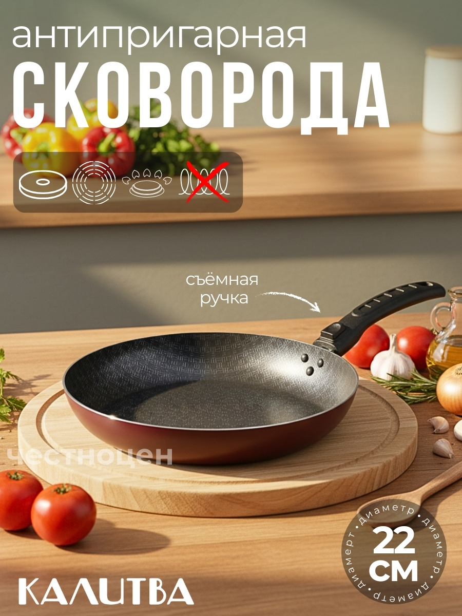 Диаметр сковороды составляет 22 см, что позволяет готовить достаточное количество пищи для всей семьи.