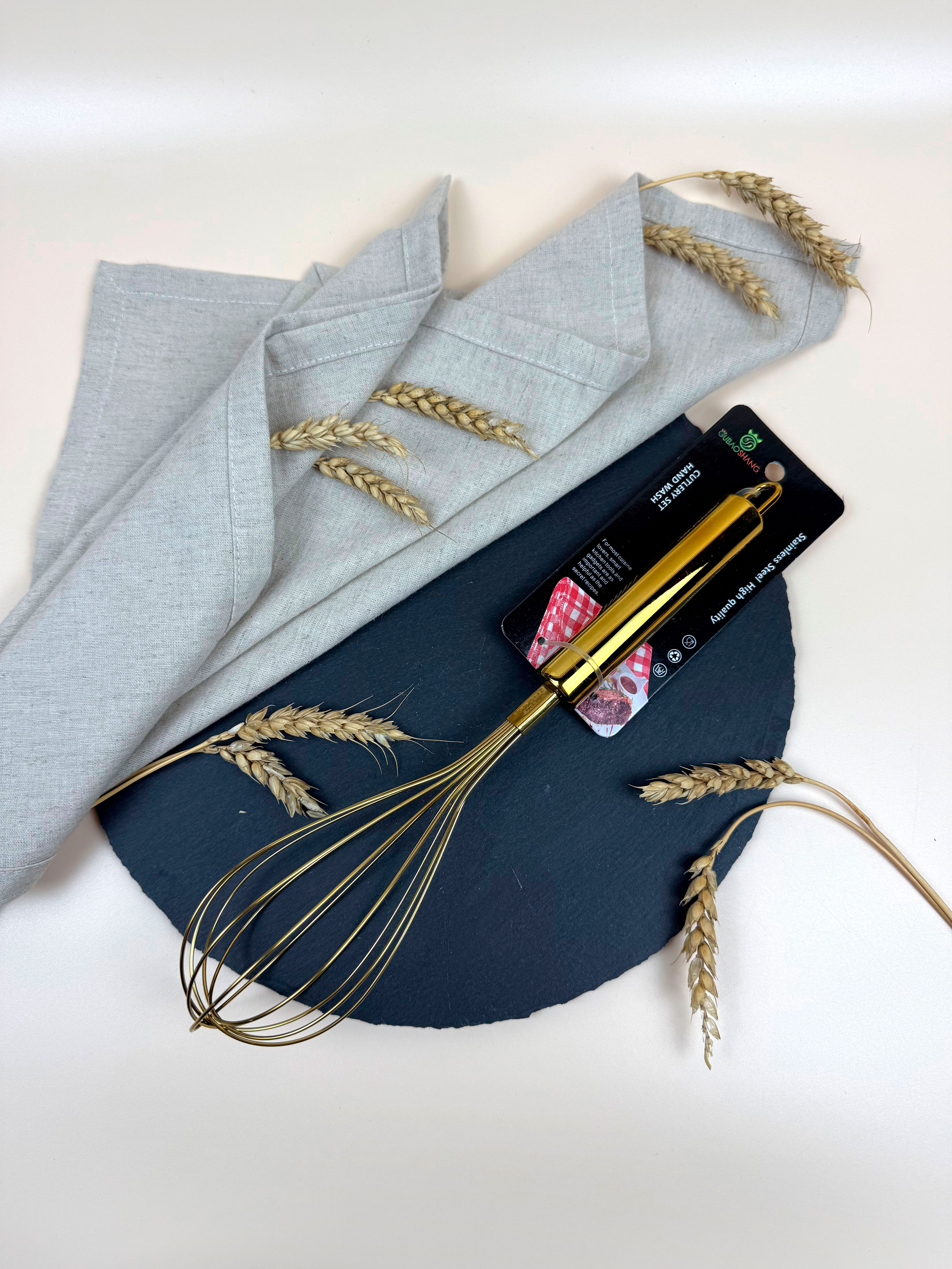 Венчик кулинарный OLS-391-1 из нержавеющей стали. Глянцевое золотистое покрытие придает инструменту современный и изысканный вид. Крепкая литая конструкция, не впитывает запахи.
