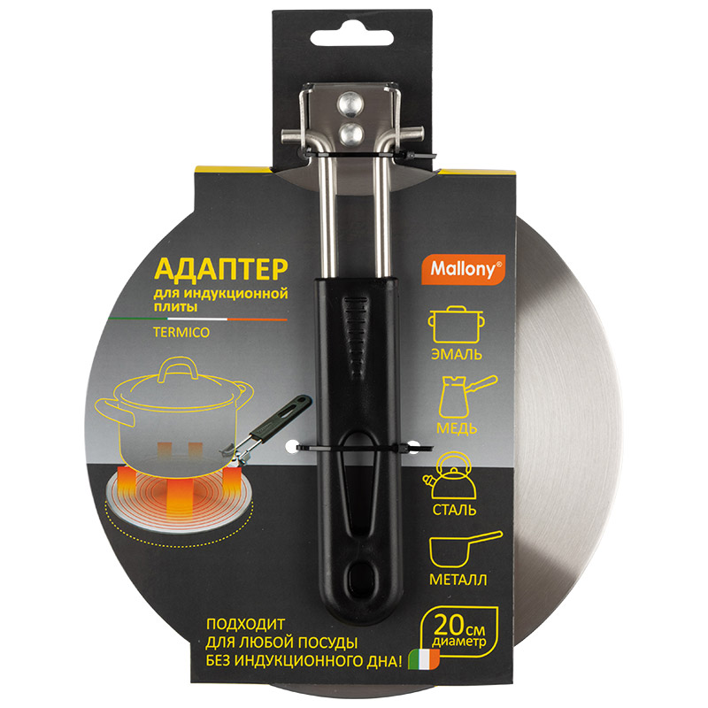 Адаптер TERMICO для индукционой плиты, диа 20 см Материал: нерж сталь 18/0+ алюминий 1050+ нерж сталь 18/0, ручка пластмасса, цвет черный. Диаметр: 20 см. Толщина: 3,5 мм. Ручка: диаметр 6 мм*длина 180 мм. Позволяет использовать посуду без индукционного дна на индукционной плите. Подупаковка 4 шт. Складная несъемная ручка. Не рекомендуется мыть в посудомоечной машине. Упаковка: цветной рукав, пакет. *Адаптер для индукционной плиты представляет собой диск толщиной 3,5 мм, состоящий из нескольких слоев - нержавеющая сталь покрывает с двух сторон центральную часть из алюминия. По характеристикам адаптер выполнен как трехслойное капсулированное дно индукционной посуды, что обеспечивает генерацию тепла внутри адаптера и делает любую посуду пригодной для использования на индукционной плите. Адаптер прост в использовании и в уходе. Использование адаптера избавляет от необходимости подбирать посуду специально для индукционных плит - теперь можно использовать любые сковороды и кастрюли, не теряя при этом отличительных