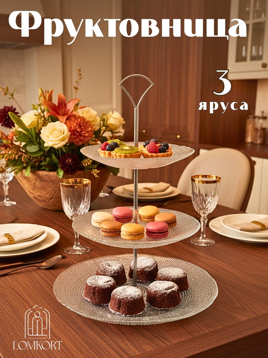 Удивите своих гостей большим ассортиментом фруктов, конфет и закусок, размещенных на трех ярусах этой элегантной вазы.