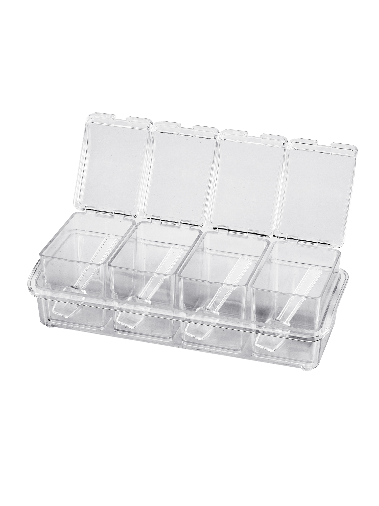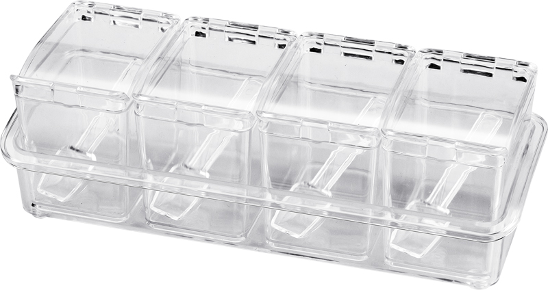 Комплект включает в себя 4 контейнера в лотке, предназначенные для хранения и организации разнообразных специй. Баночки имеют прозрачные крышки и ложечки внутри.