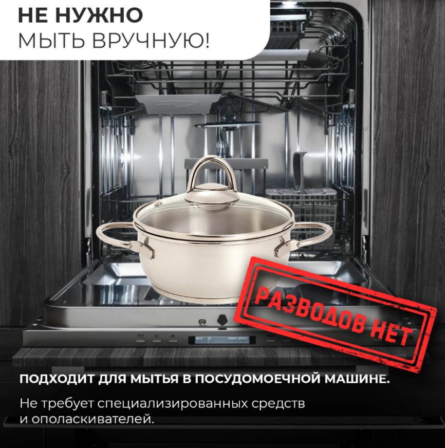 Многослойное тепло-распределительное дно (AISI 430) обеспечивает равномерный нагрев без пригорания. Прутковые ручки удобны в использовании, а стеклянная крышка с отверстием для выхода пара позволяет контролировать процесс приготовления. Зеркальная полировка придаёт кастрюле аккуратный внешний вид, подходящий под любую кухню.