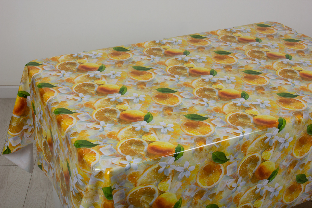 Клеёнка из 100 % ПВХ на тканой основе с печатным рисунком и глянцевой поверхностью.