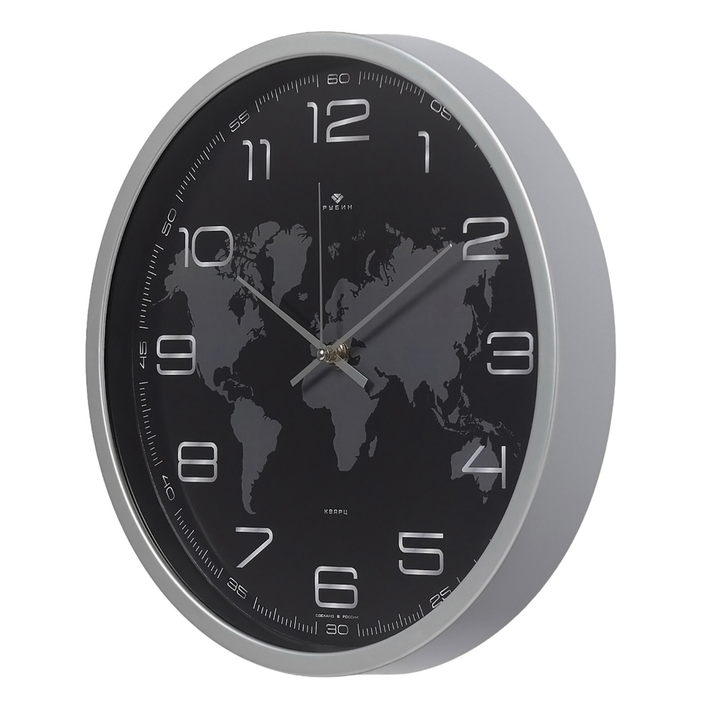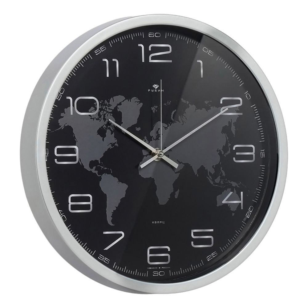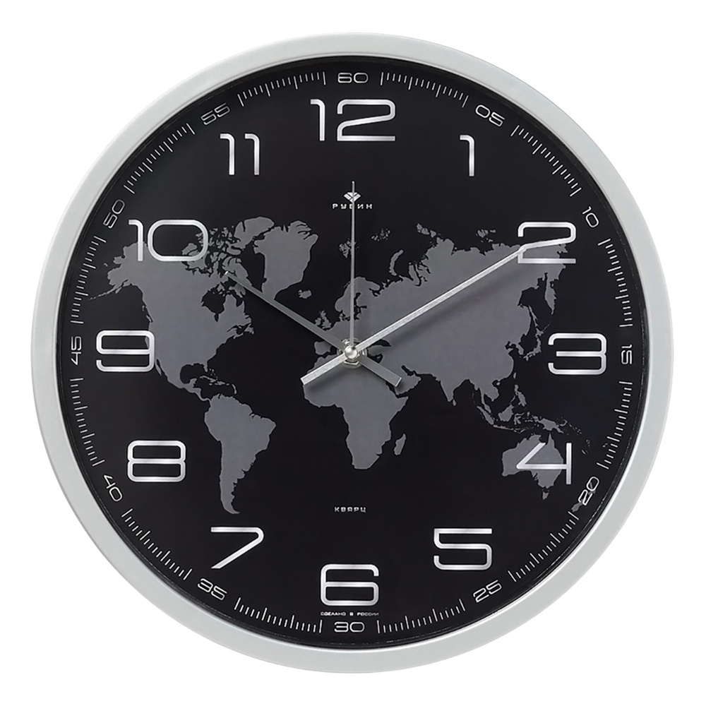 Настенные часы «Карта мира» — стиль и функциональность в одном изделии!Современный внешний вид: лаконичный чёрный фон в сочетании с контрастными белыми цифрами и стрелками создаёт эффектный визуальный образ.Универсальность: подойдут для любого помещения — гостиной, спальни, кабинета, прихожей. Легко впишутся как в классический, так и в современный интерьер.Надёжность: кварцевый механизм обеспечивает точность хода и долговечность эксплуатации.