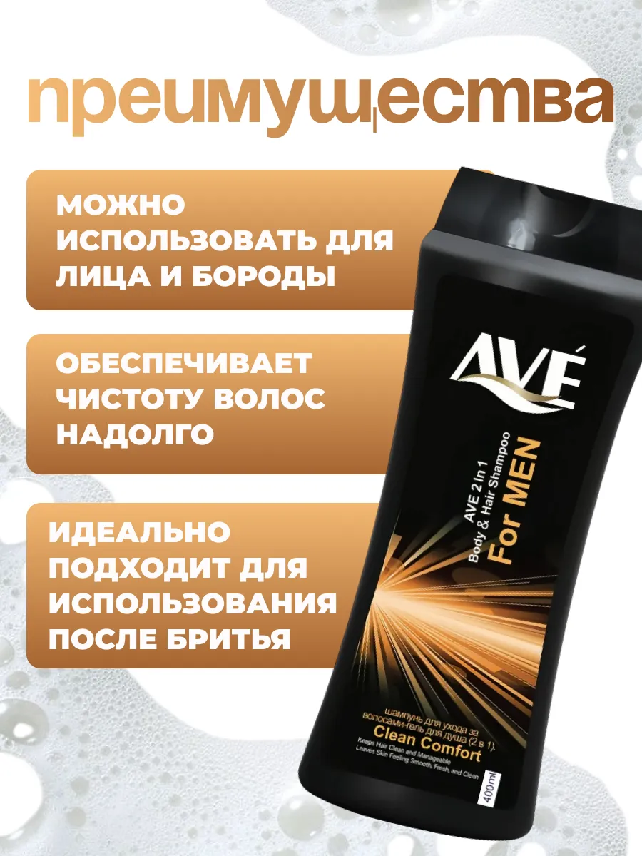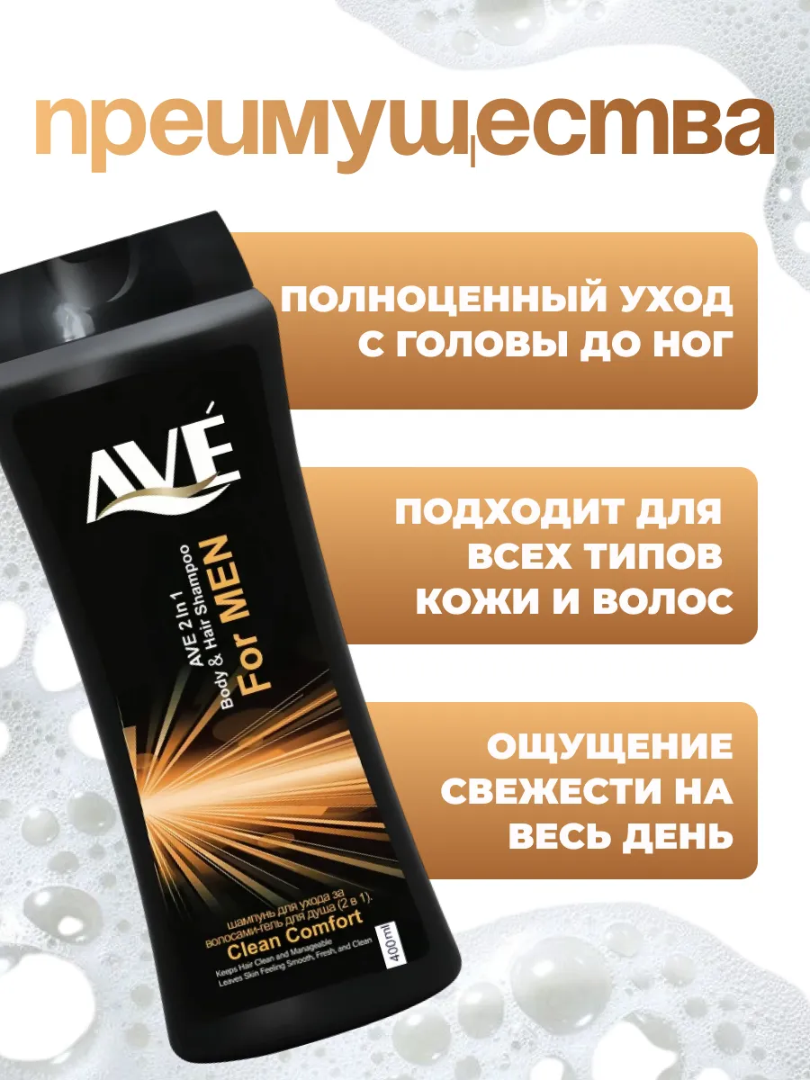 AVE Шампунь-гель Мужской Совершенный комфорт 400 мл, 1 шт. Шампунь-гель для душа AVE Clean Comfort For Men разработан специально для мужчин. Благодаря мягким, но активным компонентам, входящим в его состав, он бережно очищает волосы, кожу тела и головы. Гель поддерживает правильный уровень pH, предотвращая появление микроорганизмов, вызывающих зуд, шелушения и воспаления на коже. А волосы он восстанавливает, увлажняет и придает блеск. Объединяет в себе 2 средства в 1, сочетая в себе все их преимущества. Имеет удобную упаковку и бодрящий свежий аромат, который придаст энергии на весь день.