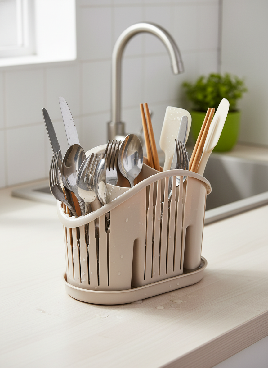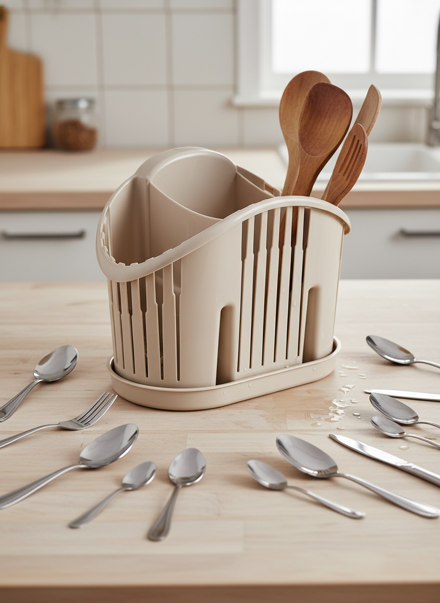 Незаменимый аксессуар для организации порядка на вашей кухне. Модель выполнена из прочного высококачественного пластика, устойчивого к влаге и бытовой химии. Продуманная конструкция с несколькими секциями позволяет удобно разделить ложки, вилки и ножи, обеспечивая их быстрое высыхание за счет эффективной вентиляции. Глубокий поддон надежно удерживает стекающую воду, защищая поверхность столешницы от сырости и налета. Благородный кофейный оттенок «мокко» гармонично дополнит современный интерьер и добавит кухне уютный акцент.