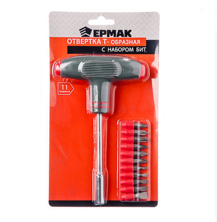 Отвертка ЕРМАК Т-обр. с набором бит 11пр. 651-137 - удобный, практичный инструмент позволяет быстро вкручивать и выкручивать винты и шурупы. Обязательно должна иметься в любом ящике с инструментами домашнего мастера или профессионального строителя.