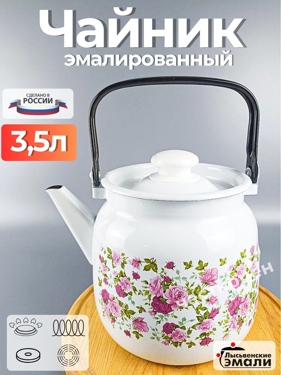 Чайник 3,5 л с подвижной ручкой обладает хорошей вместительностью. За один раз в нем можно вскипятить до 3.5 л воды, поэтому вы сможете побаловать вкусными горячими напитками всю вашу семью. Чайник эмалированный.