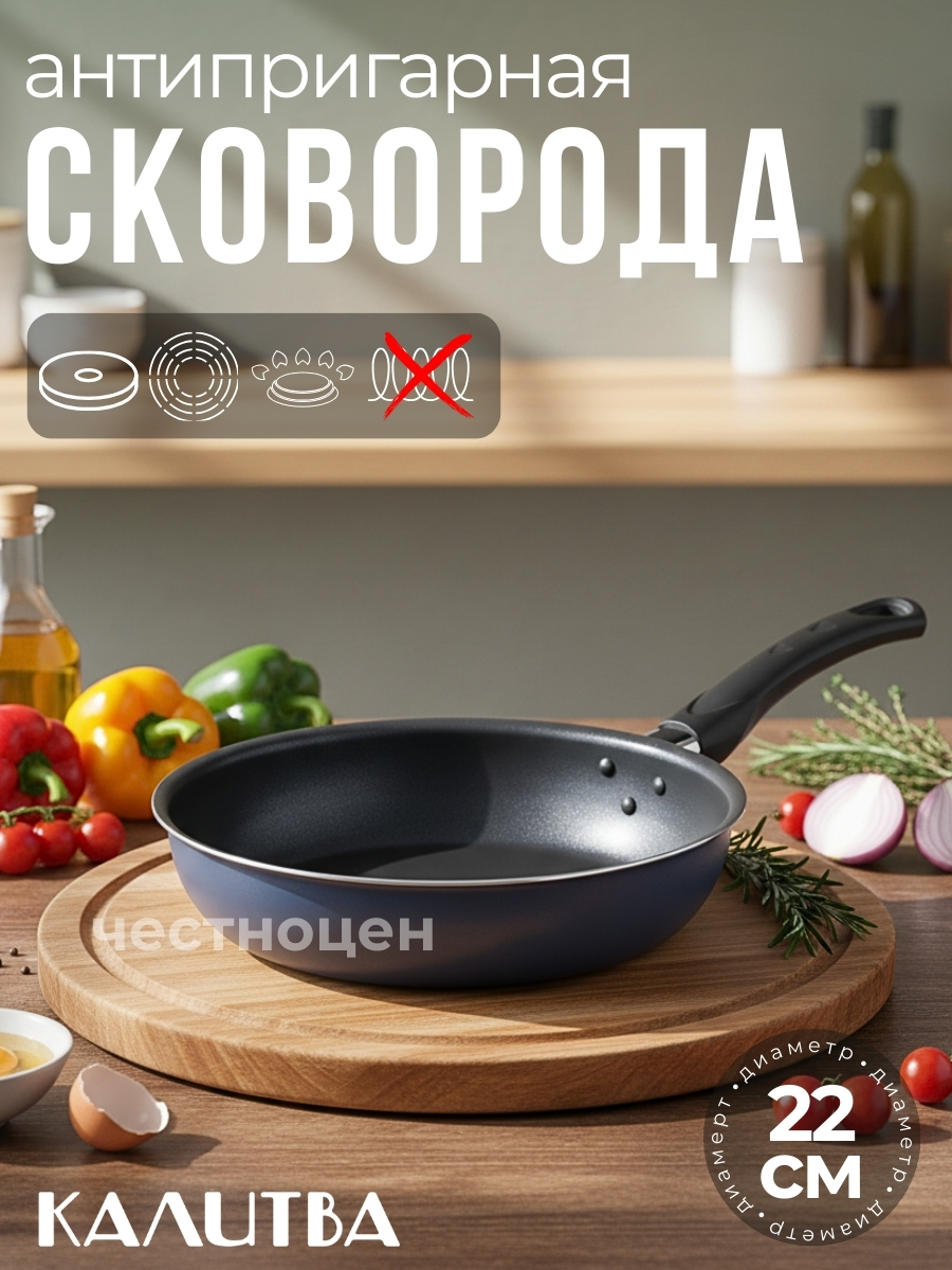 Сковорода Сатин диаметром 22 см – простая, легкая и надежная посуда на каждый день по доступной цене. Антипригарное покрытие внутри надежно защищает еду от пригорания, внешний слой декоративного покрытия также имеет антипригарные свойства, легко моется и долго сохраняет аккуратный вид и насыщенный синий цвет.Прочный корпус из штампованного алюминия с эргономичной бакелитовой ручкой делает использование сковороды удобным и безопасным.Сковорода Сатин подойдет для жарки любых блюд повседневного меню: мяса, рыбы, овощей, гарниров и полуфабрикатов на электрической или газовой плите.